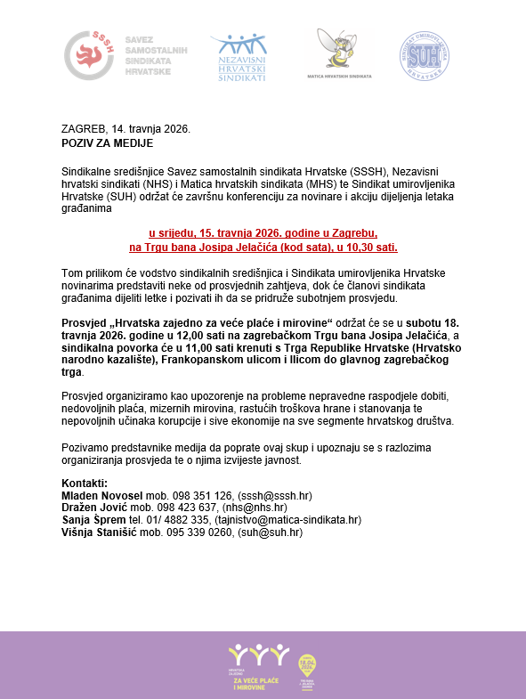Sindikati pozivaju na prosvjed „Hrvatska zajedno za veće plaće i mirovine“